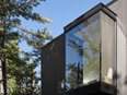Perched upon a rocky outcrop overlooking Lac Cupidon in Sainte-Anne-des-Lacs, Quebec, this 3,600 sq. ft. single-family home is situated at the highest point of a densely wooded, four-acre site in the Laurentians, roughly 65 km north of Montreal. The building features a dark, upper volume which rests upon an exposed concrete plinth and is characterized by a majestic entrance portal, large window openings, and two fully glazed projections - the living room and the library - which extend toward the lake and surrounding trees.