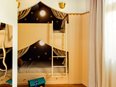 These contemporary, site-specific interventions include a cosmic mural by Maldo Nollimerg in the dining room, stained glass windows by Atelier Toporkoff in the living room, a draped fireplace by Southway Studio, a library-themed mural by Garance Vallée in one of the bedrooms, a painted entrance by Galatée Martin, and a trompe-l’oeil stairwell fresco by Mauro Ferreira.