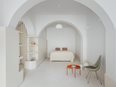 The project occupies the space with light elements which, through their shape and materiality, divide the space and create a dialogue with the existing arches.”
